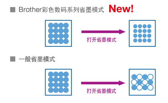 選擇Brother省墨模式可以節(jié)省墨粉消耗。兄弟彩色數(shù)碼系列省墨模式是通過(guò)縮小墨點(diǎn)空間來(lái)完成的,墨點(diǎn)的數(shù)量沒(méi)有改變,即使使用了省墨模式也不會(huì)影響打印質(zhì)量。